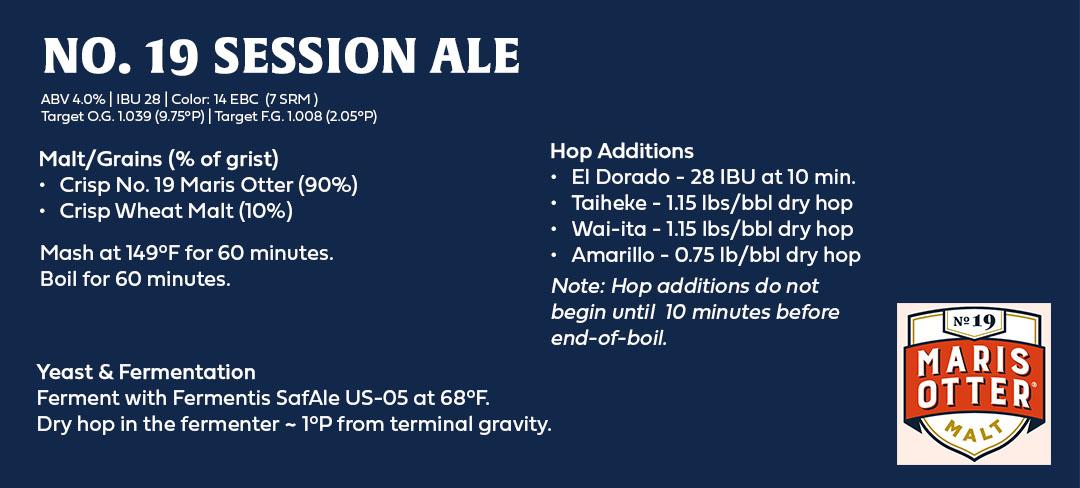 The simple grist of No. 19 Floor-Malted Maris Otter and Wheat Malt provides unique bready, slightly earthy flavors with medium body to build the perfect foundation for the fruity New Zealand and American hops. Crisp still suggests a 60-minute boil on this beer to drive off any possible DMS, but the beer achieves the combination of lower IBU and wonderful hop flavor by adding hops only at 10 minutes before knockout and then as dry hops in the fermenter near terminal gravity. SafAle™ US-05 is a great choice of yeast for this style; it leaves a clean neutral yeast flavor and finish that lets the No. 19 shine.
