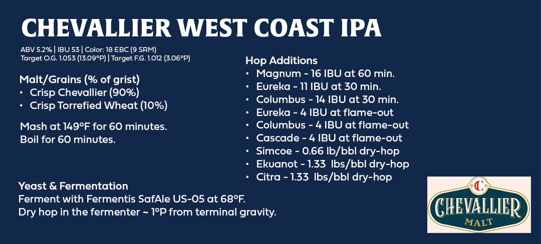 Crisp describes this beer as the best of British malts meeting the best of American hops. Chevallier Heritage Malt gives the beer a lovely golden color and provides a deep maltiness with marmalade-like sweetness and subtle fresh bread character that stands up to the hop load for a beer that is bold and hoppy, but won’t wallop you over the head with alcohol. This recipe is built to be as drinkable as possible. It’s a little bit lower gravity than you might see in many West Coast IPAs, but the IBUs stand firm to bring an almost traditional or old-school West Coast IPA level of bitterness and piney/citrus flavor compared to some current interpretations of the style that lean softer on the palate and more tropical and juicy fruit on the hops. Just a touch of wheat malt (or dextrin malt) for body and head retention is all that is needed.
