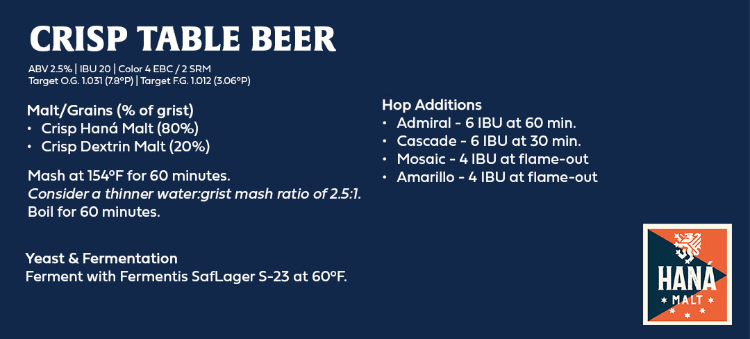 “A 2.5% ABV beer is always going to be a challenge and you have to pull out some different tools to get it to have the body, texture, and finish that you want without being too thin. Haná Malt brings a lighter color and flavor, but still has depth. The dextrin malt is what’s going to give this beer its body; it’ll leave unfermented sugars and give it a silkier mouthfeel.